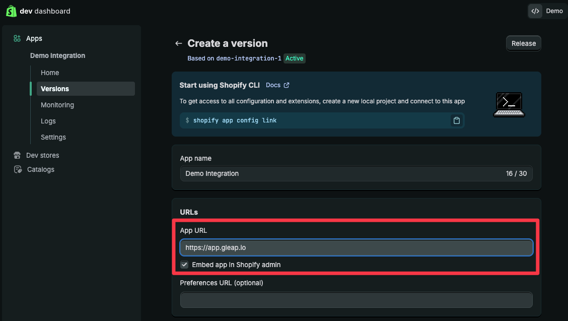 Open Gleap Dashboard → Integrations → Shopify